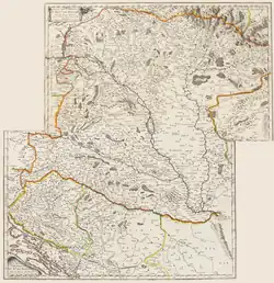 La conquête de la Hongrie par les Habsbourg est entérinée en 1699 par la paix de Karlowitz, et achevée en 1718 au traité de Passarowitz[6] par le rattachement du Banat[7]. Le royaume habsbourgeois de Hongrie comprend ainsi des territoires actuellement hongrois, autrichiens (Burgenland), slovaques (Haute-Hongrie), polonais (dans les comitats de Szepzs/Spisz et d'Árva/Orava), ukrainiens (Ruthénie), roumains (Marmatie méridionale et Partium ou Körösvidék), serbes (Bacska), croates (Baranya méridional) et slovènes (Muravidék). En revanche, jusqu'en 1867, le Banat (qui rejoint l'empire des Habsbourg le ), et le Grand-duché de Transylvanie (aux Habsbourg depuis 1699) forment encore des entités à part, protocolairement attachées à la couronne hongroise mais où la noblesse hongroise garde peu de pouvoirs et dont les gouverneurs sont nommés (depuis 1711 en Transylvanie) directement par les empereurs Habsbourg, à la place des bans et des princes hongrois jadis élus par la Diète ; les Habsbourg y établissent des confins militaires dont les habitants reçoivent des franchises[8] en échange de leur service contre les incursions des akindjis ottomans[9],[10],[11],[12].