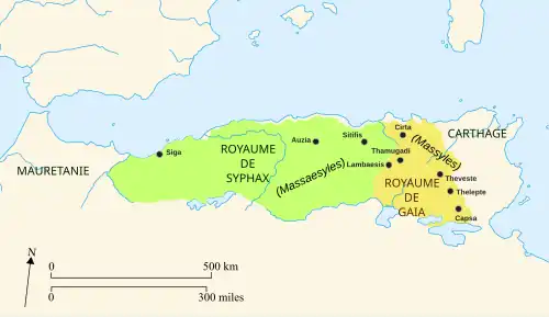 - Liste des rois de Numidie, dont Gaïa (260c-206), Syphax (225-203/202), Sophonisbe (235-203), Massinissa (238-148)
