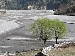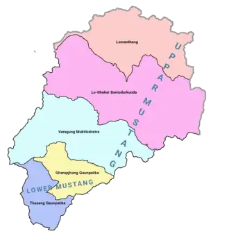 La rivière Kâlî Gandhakî prend sa source sur le territoire du Mustang à une altitude de 5 000 mètres et y développe sa vallée, partageant son territoire dans le sens du nord-est vers le sud-ouest et s'écoulant vers le Terai népalais. Cette vallée était autrefois une route commerciale entre l'Inde et le Tibet, en particulier pour le sel. Une partie de la vallée de la Gandhakî, le Thak Khola (en), forme une gorge très profonde.