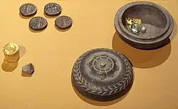 - ↑ Henri-Paul Francfort « Les modèles gréco-bactriens de quelques reliquaires et palettes à fards "gréco-bouddhiques" » : Arts Asiatiques 1976. Mais il s'agit, ici, d'un reliquaire procédant d'un autre type.