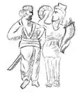Sur leurs pièces et dans l'art du Gandhara, les Indo-Parthes sont dépeints avec de courtes vestes croisées et de grands pantalons bouffants, costume éventuellement complété par un sur-pantalon[15]. Leurs vestes sont ornées de rangées d'anneaux ou de médailles décoratives. Leur chevelure est généralement touffue et contenue avec un bandeau, une pratique largement adoptée par les Parthes à partir du Ier siècle de notre ère[16]. Des individus en tenue indo-parthe sont parfois présentés dans les scènes de dévotion bouddhistes, sur des éléments architecturaux.