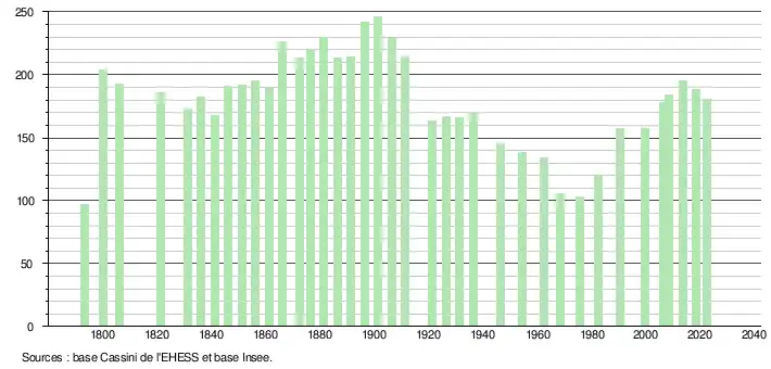 L'évolution du nombre d'habitants est connue à travers les recensements de la population effectués dans la commune depuis 1793. Pour les communes de moins de 10000habitants, une enquête de recensement portant sur toute la population est réalisée tous les cinqans, les populations de référence des années intermédiaires étant quant à elles estimées par interpolation ou extrapolation[87]. Pour la commune, le premier recensement exhaustif entrant dans le cadre du nouveau dispositif a été réalisé en 2008[88].