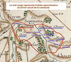 La carte de Cassini ci-dessus montre qu'au XVIIIe siècle, Rozière est une paroisse située sur la rive gauche de la rivière de la Crise.