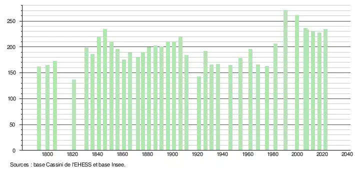 L'évolution du nombre d'habitants est connue à travers les recensements de la population effectués dans la commune depuis 1793. Pour les communes de moins de 10 000 habitants, une enquête de recensement portant sur toute la population est réalisée tous les cinq ans, les populations de référence des années intermédiaires étant quant à elles estimées par interpolation ou extrapolation[29]. Pour la commune, le premier recensement exhaustif entrant dans le cadre du nouveau dispositif a été réalisé en 2007[30].