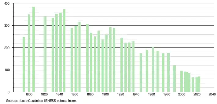 L'évolution du nombre d'habitants est connue à travers les recensements de la population effectués dans la commune depuis 1793. Pour les communes de moins de 10 000 habitants, une enquête de recensement portant sur toute la population est réalisée tous les cinq ans, les populations de référence des années intermédiaires étant quant à elles estimées par interpolation ou extrapolation[26]. Pour la commune, le premier recensement exhaustif entrant dans le cadre du nouveau dispositif a été réalisé en 2004[27].