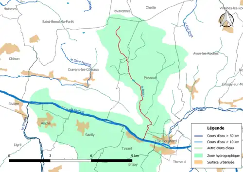 Le Ruau traverse 3 communes, soit de l'amont vers l'aval : Cravant-les-Côteaux (37), Panzoult (37), L'Île-Bouchard (37).