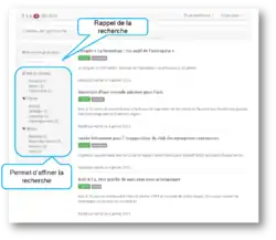 Sur la base d’une recherche plein texte, les facettes propose un affinage automatique des résultats par auteur, type de document, date de publication, format de document… mais également sur la base des taxonomies applicables. Cette recherche peut également être couplée à des fonctions de géolocalisation.