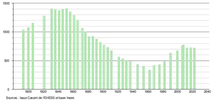 L'évolution du nombre d'habitants est connue à travers les recensements de la population effectués dans la commune depuis 1793. Pour les communes de moins de 10 000 habitants, une enquête de recensement portant sur toute la population est réalisée tous les cinq ans, les populations de référence des années intermédiaires étant quant à elles estimées par interpolation ou extrapolation[26]. Pour la commune, le premier recensement exhaustif entrant dans le cadre du nouveau dispositif a été réalisé en 2007[27].