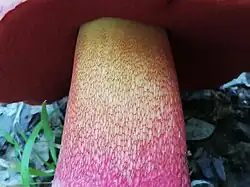 Son stipe mesure 8 à 12 cm de long et 4 à 8 cm de large, il est orné d'un réseau. Sa surface est orangeâtre au début, avec une base violacée, puis, passant par des tons intermédiaires orange-rouge, à la fin rouge vif, rouge sang, rouge pourpre, souvent plus sombre à la base, souvent avec une bande évidente jaune foncé ou jaune orangé dans la partie supérieure[1],[3],[5].