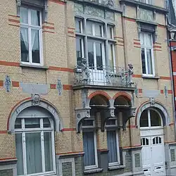 - au no 32, se démarquant des autres immeubles de la rue, cette imposante demeure de style éclectique mais de décoration Art nouveau, érigée en brique blanche et bandeaux de brique rouge possède plusieurs mosaïques sur fond vert et une dizaine de sculptures en pierre dont deux gargouilles se dressant aux coins du balcon et d'autres sous forme de figurines ; l'immeuble aurait été réalisé par l'architecte J. Bernimolin en 1901[6],