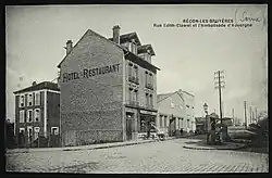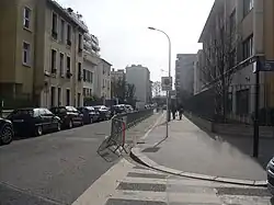 La rue Edith-Cavell, à l'angle de la rue Volta, vers le nord. La poste a été remplacée par un local commercial, dans le même immeuble. Au fond, se trouve le pont des Bruyères. | |||