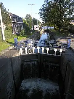 L'écluse de Rivage-en-Pot est la première écluse située au PK 0,00 à une cinquantaine de mètres de l'embouchure de son bief aval dans la Meuse. Mise en service en 1847 mais achevée en 1854, elle fut détruite en 1944 mais tout de suite reconstruite après la guerre en 1945. C'est la seule écluse qui ait gardé ses portes et qui soit encore en état de fonctionnement. L'ouvrage est fermé par deux portes à deux vantaux et bordé par des murs de quai en grand appareil de calcaire[2]. Avec le pont-levant des Aguesses, cette écluse est reprise sur la liste du patrimoine immobilier classé de Liège.