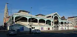 - Les halles centrales de Lille, situées le long de la rue Solferino, ont été édifiées à la suite du septième plan d'agrandissement de 1858. Ancêtres du Marché d'Intérêt National, ces halles représentaient un lieu d'échange de denrées entre les producteurs et les détaillants[1]. Elles sont à présent investies par un supermarché.