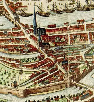 - ↑ Elle est connue sous le nom de « porte de Sock » ou « porte de Chock ». Après la construction de la deuxième enceinte au XVIe siècle, elle devient la fausse porte de Saint-Nicolas.