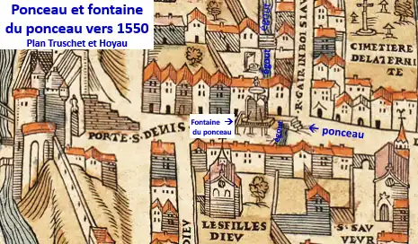 Porte Saint-Denis, aux environs des actuels 285 et 248 rue Saint-Denis (plan de Truschet et Hoyau, vers 1550).