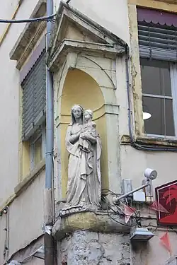 C'est une statue de la Vierge Marie placée dans une niche qui lui donne son nom, avec le nom de Terreaux pour ne pas la confondre avec d'autres rues Sainte-Marie, de Lyon[4].