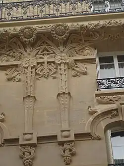 Les façades donnant sur les deux rues, et plus particulièrement les soubassements des balcons galbés en fer forgé, sont abondamment décorées de bas-reliefs représentant des tournesols, des iris et des chardons, avec des lézards, des libellules et autres petits animaux.