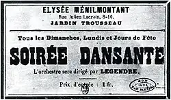 L'Élysée-Ménilmontant a continué les traditions de l'île d'Amour ; son vaste jardin, planté d'arbres séculaires, ses mille becs de gaz, son splendide salon de 600 couverts très propice aux grandes noces, aux repas de corps, aux bals publics, en font un séjour enchanteur, très recherché par la jeunesse folâtre et bruyante.