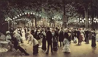 Ce soir-là, l'Élysée-Ménilmontant était resplendissant de lumière, et tout bruyant de musique et de rires joyeux. Un municipal, ganté de blanc et les mains croisées, se tenait debout, gravement, près du contrôle. Autour du jardin, des girandoles couraient en arcades lumineuses, éclairant le feuillage vert cru des arbres dont les branches hautes se noyaient dans l'ombre et le vague.