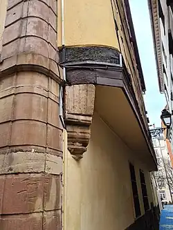- Sur un emplacement cité dès 1427, à l'angle de l'actuelle Grand-Rue, l'immeuble a été construit par un boulanger au milieu du XVIIIe siècle[15]. La façade de l'édifice qui donne sur la Grand-Rue se caractérise par un chaînage d'angle à refends, des encadrements de fenêtres en grès et des linteaux de fenêtres cintrés[16]. Dans l'étroite ruelle, la façade latérale à encorbellement est dotée de colombages.