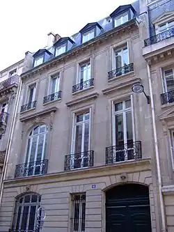 Sous l'Occupation allemande, siège du service d'assistance sociale de l'Union générale des israélites de France (UGIF). Le 30 juillet 1943, Aloïs Brunner y opère une rafle[7]. Sur la façade, une plaque commémorative rend depuis hommage aux 67 Juifs qui en ont été victimes. - No 36 : hôtel où vécurent Auguste Vincent Pierre Charles de Gourcuff, directeur des AGF, fils d'Auguste Casimir Marie de Gourcuff, fondateur des AGF et promoteur immobilier, puis à partir de 1893 l'industriel et homme politique Lazare Weiller (1858-1928) et sa femme, née Alice Javal.