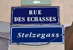 À partir de 1995, des plaques de rues bilingues, à la fois en français et en alsacien, sont mises en place par la municipalité lorsque les noms de rue traditionnels étaient encore en usage dans le parler strasbourgeois[3]. Le nom de la rue est ainsi sous-titré Stelzegass.