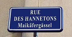 Des plaques de rues bilingues, à la fois en français et en alsacien, ont été mises en place par la municipalité à partir de 1995[3]. C'est le cas du Maikäfergässel.