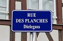 À partir de 1995, des plaques de rues bilingues, à la fois en français et en alsacien, sont mises en place par la municipalité lorsque les noms de rue traditionnels étaient encore en usage dans le parler strasbourgeois[3]. Le nom de la rue est ainsi sous-titré Dielegass.