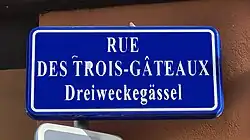 À partir de 1995, des plaques de rues bilingues, à la fois en français et en alsacien, sont mises en place par la municipalité lorsque les noms de rue traditionnels étaient encore en usage dans le parler strasbourgeois[5]. Le nom de la rue est ainsi sous-titré Dreiweckegässel.