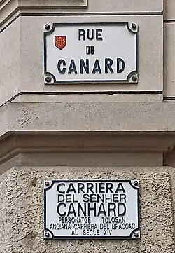 Malgré ce que semble suggérer la plaque de rue en occitan apposée dans les années 2000, la rue du Canard ne fut jamais la rue de Bracoal (carrièra de Bracoal en occitan). C'est l'actuelle impasse du Canard qui portait ce nom entre les XIVe et XVIIIe siècles[3].