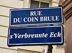 À partir de 1995, des plaques de rues bilingues, à la fois en français et en alsacien, sont mises en place par la municipalité lorsque les noms de rue traditionnels étaient encore en usage dans le parler strasbourgeois[5]. Le nom de la rue est ainsi sous-titré s'Verbrennte Eck.