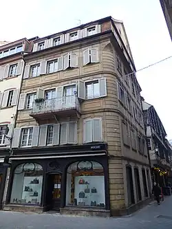 L'immeuble néo-classique abritant une pharmacie, qui forme l'angle avec le no1 de la rue des Juifs[30], se trouve sur l'emplacement de deux maisons à caractère médiéval qui, jusqu'à la Révolution, ne formaient qu'une seule propriété, le no21 avec des fenêtres en ogive et à meneaux, le no23 doté d'une tourelle d’angle avec créneaux et mâchicoulis. Elles sont reconnaissables sur un dessin de Silbermann, repris et enrichi de détails et de texte par Alfred Touchemolin pour l'ouvrage de Frédéric Piton, publié en 1855.