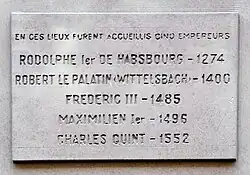 Pour perpétuer la mémoire de l'hospitalité que sa maison avait donnée à ses illustres hôtes, son propriétaire fait peindre, en 1539, à côté de la porte, les armoiries impériales et une inscription[32].