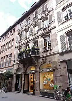 À l'angle avec le no22 de la place Broglie d'une part et le no2 de la rue Brûlée d'autre part, ce grand immeuble éclectique destiné au Crédit foncier d'Alsace et de Lorraine est construit par Édouard Roederer à partir de 1873[5]. Sur cet emplacement, à l'origine, on trouve d'abord le Poêle (siège de la corporation) des Maçons, auquel succède au début du XVIesiècle celui des Tailleurs. En 1853 ces maisons sont remplacées à leur tour par un immeuble construit par un certain Scheidecker, ce qui lui vaut quelquefois le nom de «maison Scheidecker.»