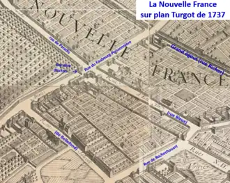 Quartier de la Nouvelle-France sur le plan de Turgot. Ponceau de la Nouvelle-France au-dessus de l'égout.