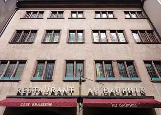 - À l'angle avec la place de la Cathédrale, l'édifice, qui fait l'objet d'une inscription au titre des monuments historiques depuis 1946[4], abrite un restaurant, succédant à une ancienne brasserie, d'abord fondée à l'enseigne Au Dauphin d'Or en 1771, renommée Au Dauphin au moment de la Révolution[5].