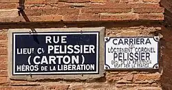 La plaque de rue originale de 1948 et celle plus récente en occitan.