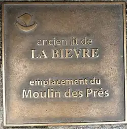 Médaillon au sol rappelant le tracé du bras vif de la Bièvre, posé en 2008.