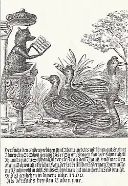 L'une des versions met en scène un cordonnier nommé Fuchs (« renard » en allemand) qui chaparde des canards du voisinage pour améliorer l’ordinaire de sa famille. Des voisins tournent la chose en dérision et inventent une histoire, celle du renard prêchant aux canards. À force de les captiver par son discours, l’animal serait parvenu à les attraper pour les manger. Un tableau de facture populaire dépeint la scène : en chaire, le renard brandit un livre ouvert devant un parterre de volatiles. Le texte inscrit sous cette scène évoque la queue du renard « celui qui la caressera le mieux sera le favori » :