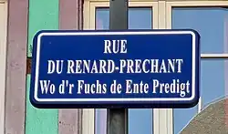 À partir de 1995, des plaques de rues bilingues, à la fois en français et en alsacien, sont mises en place par la municipalité lorsque les noms de rue traditionnels étaient encore en usage dans le parler strasbourgeois[12]. La rue du Renard-Prêchant est alors sous-titrée Wo d'r Fuchs de Ente Predigt.