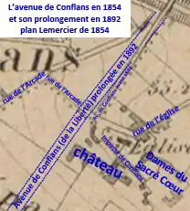 - du tronçon sud de l’avenue de Conflans (actuelle avenue de la Liberté) avant son prolongement vers la Seine en 1892. L'avenue se terminait antérieurement au croisement avec la rue de l’Arcade (déplacé depuis ce prolongement) et avec la rue de l’Église, actuelle rue du Président-Kennedy.