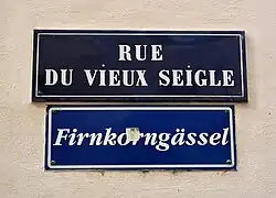 Des plaques de rues bilingues, à la fois en français et en alsacien, ont été mises en place par la municipalité à partir de 1995[6]. C'est le cas du Firnkorngässel.