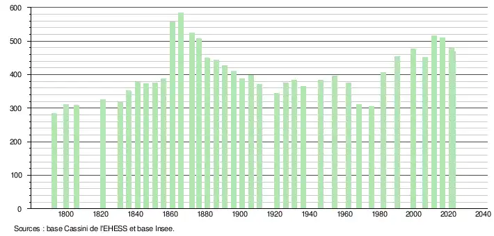 - ↑ Population municipale de référence en vigueur au 1er janvier 2025, millésimée 2022, définie dans les limites territoriales en vigueur au 1er janvier 2024, date de référence statistique : 1er janvier 2022.