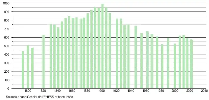 L'évolution du nombre d'habitants est connue à travers les recensements de la population effectués dans la commune depuis 1793. Pour les communes de moins de 10 000 habitants, une enquête de recensement portant sur toute la population est réalisée tous les cinq ans, les populations de référence des années intermédiaires étant quant à elles estimées par interpolation ou extrapolation[32]. Pour la commune, le premier recensement exhaustif entrant dans le cadre du nouveau dispositif a été réalisé en 2006[33].