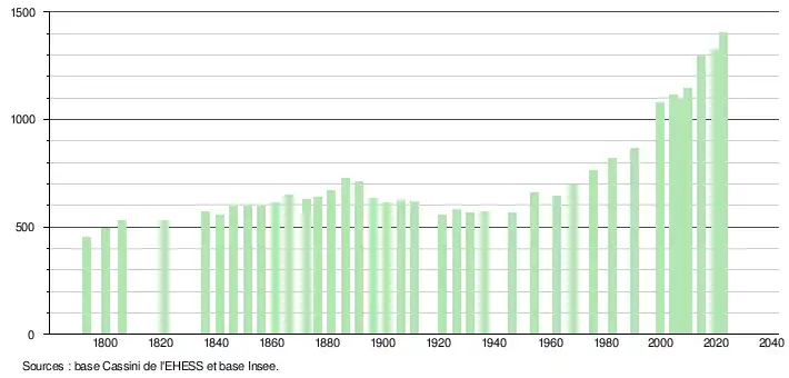 L'évolution du nombre d'habitants est connue à travers les recensements de la population effectués dans la commune depuis 1793. Pour les communes de moins de 10 000 habitants, une enquête de recensement portant sur toute la population est réalisée tous les cinq ans, les populations de référence des années intermédiaires étant quant à elles estimées par interpolation ou extrapolation[13]. Pour la commune, le premier recensement exhaustif entrant dans le cadre du nouveau dispositif a été réalisé en 2004[14].