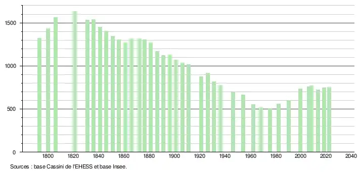 L'évolution du nombre d'habitants est connue à travers les recensements de la population effectués dans la commune depuis 1793. Pour les communes de moins de 10 000 habitants, une enquête de recensement portant sur toute la population est réalisée tous les cinq ans, les populations de référence des années intermédiaires étant quant à elles estimées par interpolation ou extrapolation[22]. Pour la commune, le premier recensement exhaustif entrant dans le cadre du nouveau dispositif a été réalisé en 2008[23].