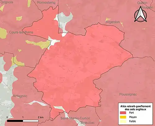 Le retrait-gonflement des sols argileux est susceptible d'engendrer des dommages importants aux bâtiments en cas d’alternance de périodes de sécheresse et de pluie[20]. 98,2 % de la superficie communale est en aléa moyen ou fort (91,8 % au niveau départemental et 48,5 % au niveau national)[Carte 2]. Depuis le , en application de la loi ELAN, différentes contraintes s'imposent aux vendeurs, maîtres d'ouvrages ou constructeurs de biens situés dans une zone classée en aléa moyen ou fort[Note 2],[21].