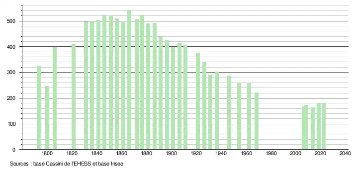 | L'évolution du nombre d'habitants est connue à travers les recensements de la population effectués dans la commune depuis 1793. Pour les communes de moins de 10 000 habitants, une enquête de recensement portant sur toute la population est réalisée tous les cinq ans, les populations de référence des années intermédiaires étant quant à elles estimées par interpolation ou extrapolation[24]. Pour la commune, le premier recensement exhaustif entrant dans le cadre du nouveau dispositif a été réalisé en 2008[25]. En 2022, la commune comptait 180 habitants[Note 3], en évolution de +7,78 % par rapport à 2016 (Lot-et-Garonne : −0,18 %, France hors Mayotte : +2,11 %). |