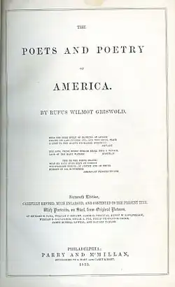 En 1842, Griswold sort son anthologie sur la poésie américaine de 476 pages, The Poets and Poetry of America[15], dédiée à Washington Allston[21]. Le recueil de Griswold présente les poèmes de plus de 80 auteurs[22], notamment 17 de Lydia Sigourney, trois d'Edgar Allan Poe et 45 de Charles Fenno Hoffman (en)[13]. Hoffman, un ami intime, dispose de deux fois plus de place qu'aucun autre auteur[23]. Griswold écrit de nombreux autres anthologies, notamment Biographical Annual, qui réunit les mémoires des « personnes éminentes récemment décédées », Gems from American Female Poets, Prose Writers of America et Female Poets of America[24]. En préparant ces anthologies, il écrirait aux auteurs vivants dont il inclut les œuvres pour demander leurs suggestions sur les poèmes à inclure, aussi bien que pour rassembler des informations pour une notice biographique[25].