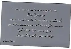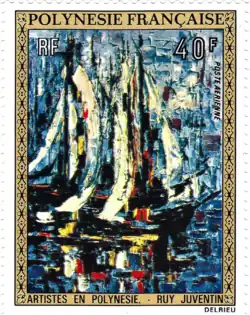 - ↑ Timbre poste aérienne moderne émis par la Polynésie en 1972 référencé YT n°66 : Ruy Juventin, d'une valeur de 40 francs Pacifique. Type : poste aérienne, région : Dom Tom, pays : Polynésie, année d'émission : 1972, format : série, qualité : Luxe, marque postale : neuf sans charnière, thème : art, éditions postales : tableaux, artistes de Polynésie, cote Yvert & Tellier : 127 euros